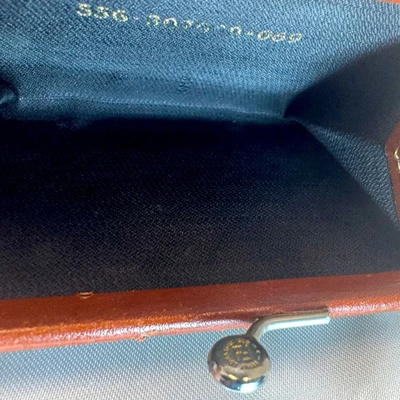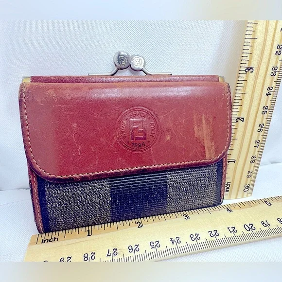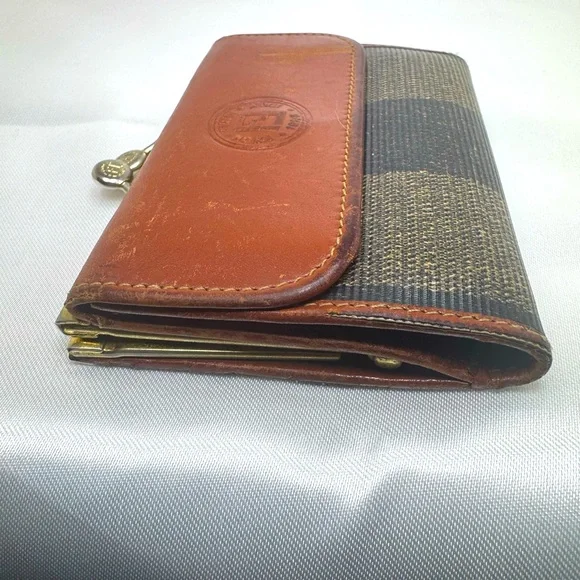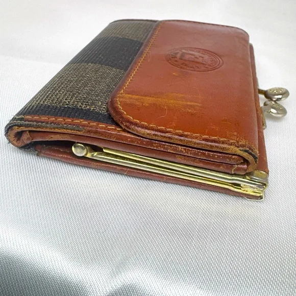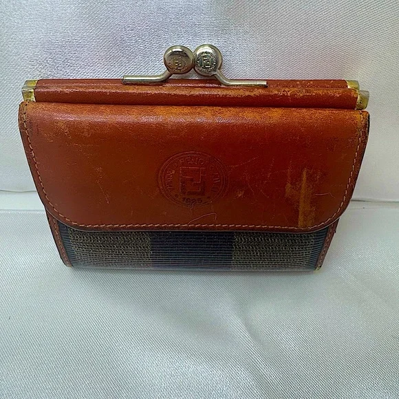 Vintage Fendi Pequin Stripe Trifold Wallet Cuoio Brown Leather Kiss Lock Coin Purse RareAuthentic vintage Fendi Pequin stripe trifold wallet with kiss lock coin pouch and full flap billfold design extremely rare format from Fendi’s 1980s small leather goods line features iconic tobacco and black Pequin stripe canvas with rich Cuoio saddle brown leather trim stamped FENDI ROMA 1925 on the front flap pre-LVMH model from boutique-only editions made in Italy interior features gold FENDI SAS plaque confirming pre-1994 production kiss lock coin pouch has black canvas lining and dual logo knobs trifold flap opens to reveal card slot full billfold and snap close storage classic gold foil serial number inside reads 536-3079-069 clean tight seams classic patina very collectible discontinued style not mass-produced like other bifold versions handmade during Fendi’s transitional era from artisanal to global luxury house museum-worthy piece for SLG or Fendi collectors seeking rare archival pieces timeless durable and truly rare to find in this condition4.5 in W x 3.5 in H closed approx 1 in DPre-loved vintage condition leather shows soft patina and light scuffs(SEE PICS) stitching strong structure intact kiss lock functions perfectly interior clean with only minimal signs of wear very well preserved for 30+ years#FendiWallet #VintageFendi #PequinStripe #FendiRoma1925 #RareFendi #FendiTrifold #AuthenticFendi #PoshLuxury #FendiFinds #BrownLeatherWallet #80sFendi #FendiKissLock