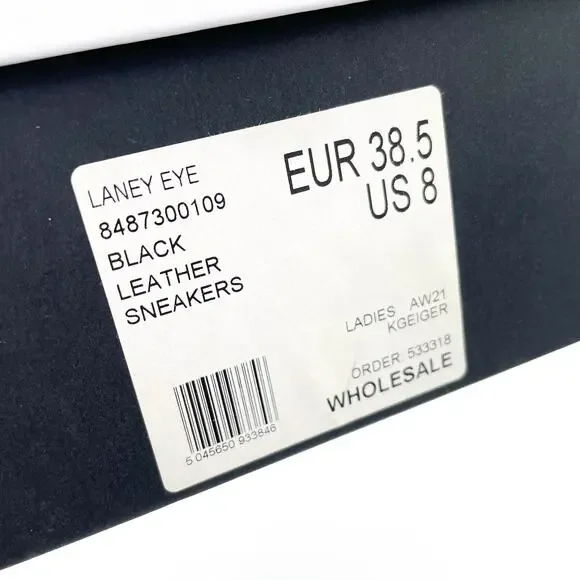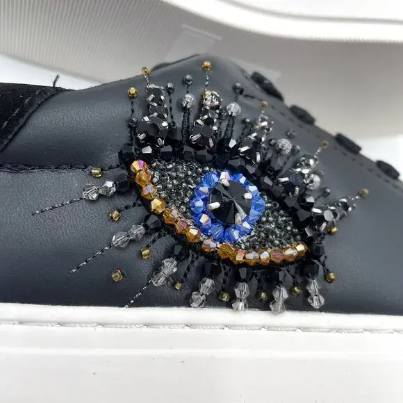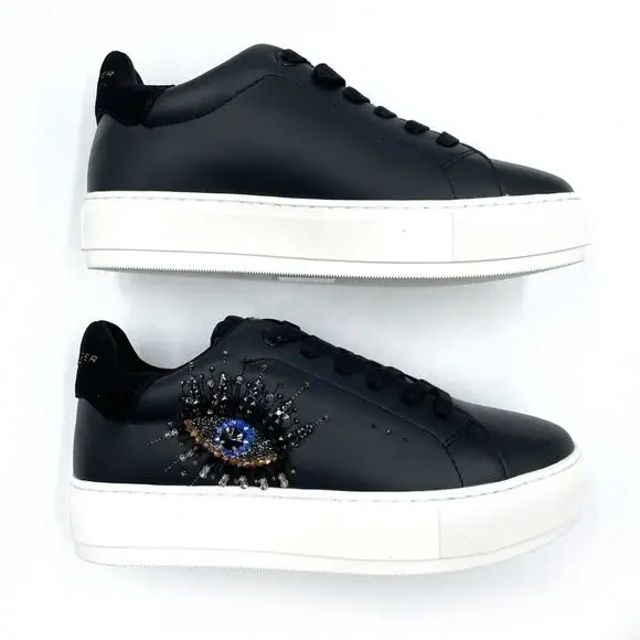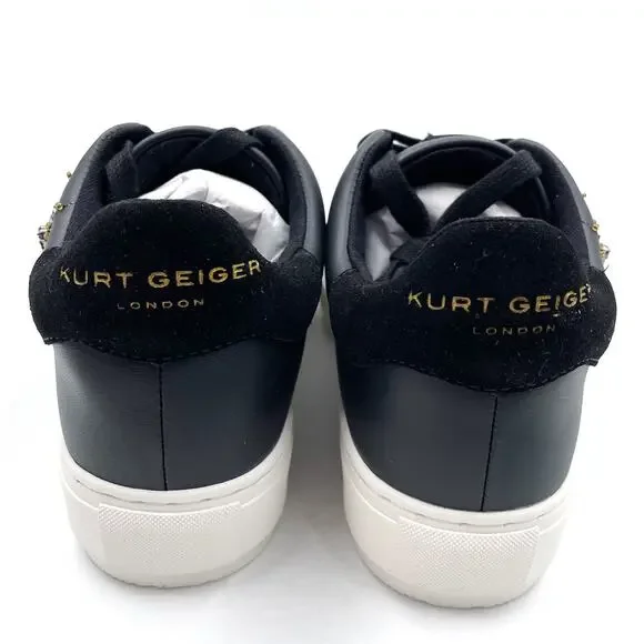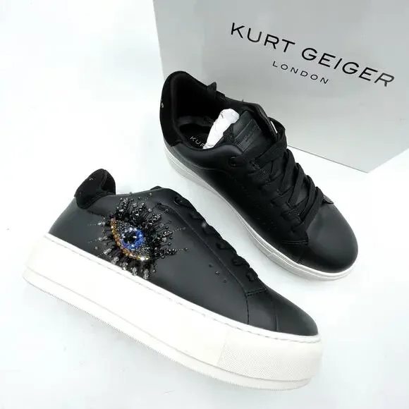 Kurt Geiger Laney Eye Sneaker Platform Black Leather Rhinestone Lace Up Sz 8New with box. Dust bag is not included.Lace-up design with rounded toe includes padded tongue and collar for all-day comfortEmbossed leather logo tag at tongueFoil logo at heel tabTextile lining and insoleTonal laces and contrast platform midsoleTextured rubber sole provides enhanced traction