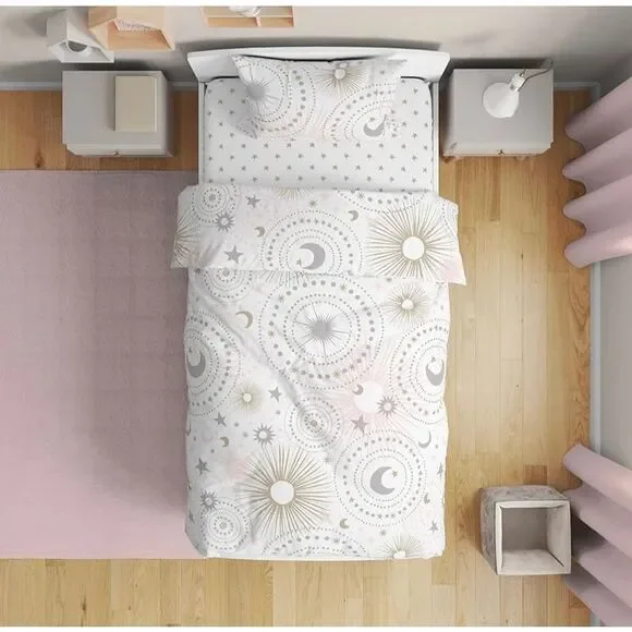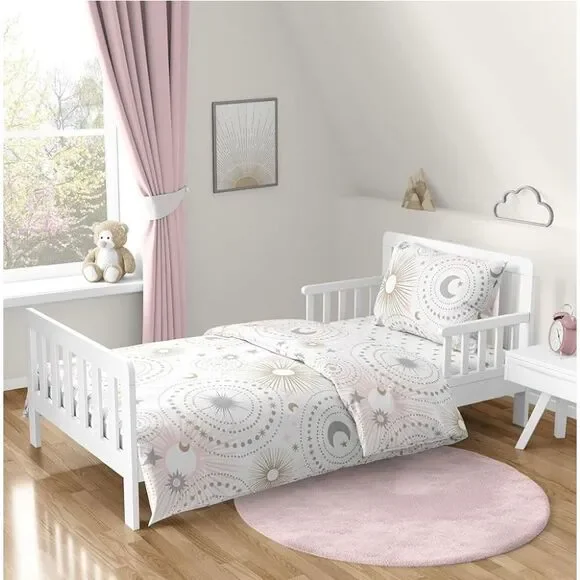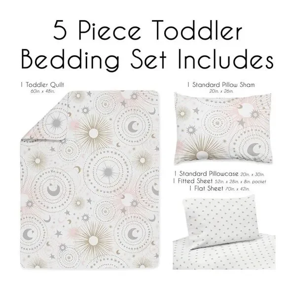 Sweet Jojo Designs Blush Pink, Gold, Grey Star, and Moon Celestial Collection Girl 5-piece Toddler-size Comforter Set will help you create a dreamy room for your little girl. This magical bedding combines stars and moons star-themed print and a coordinating metallic gold star print. The beautiful color palette of blush pink, metallic gold, grey, and white will set your child’s room up in high style. This set fits most standard cribs and toddler beds. This includes the comforter, Pillow Sham, Fitted Sheet, Flat Sheet, and Pillow Case.• NEW IN BAG• Please review the size and pictures closely before purchasing.• NO RETURNSProduct color may vary slightly due to photographic lighting sources or your monitor settings!***Item: K34All items are loaded with clear, detailed pictures, pre-checked, firmly well packed, bagged or covered with foam/bubble wrap, and sealed with extra taping. Images and recorded support items with a video before packaging and after for your security protection and mine!•Tags- Household Items19th Century, 70’s, 80’s, 90’s, 00’s, aluminum, antique, art, bamboo, bar, basket, bathroom, bath rug, beads, bedroom, birthday, bohemian, boho, brandy glass, brass, bread basket, bronze, buffet, butterfly, caddy, canister, carvingcater, centerpiece, ceramic, chair, chalk,charms, Christmas, classic, classy, cleaning, cold, cuisine, beverage, collection, collector, coffee, coffee, cup, colorful, contemporary, cooking, country, cowboy, crazy, crystal, cup