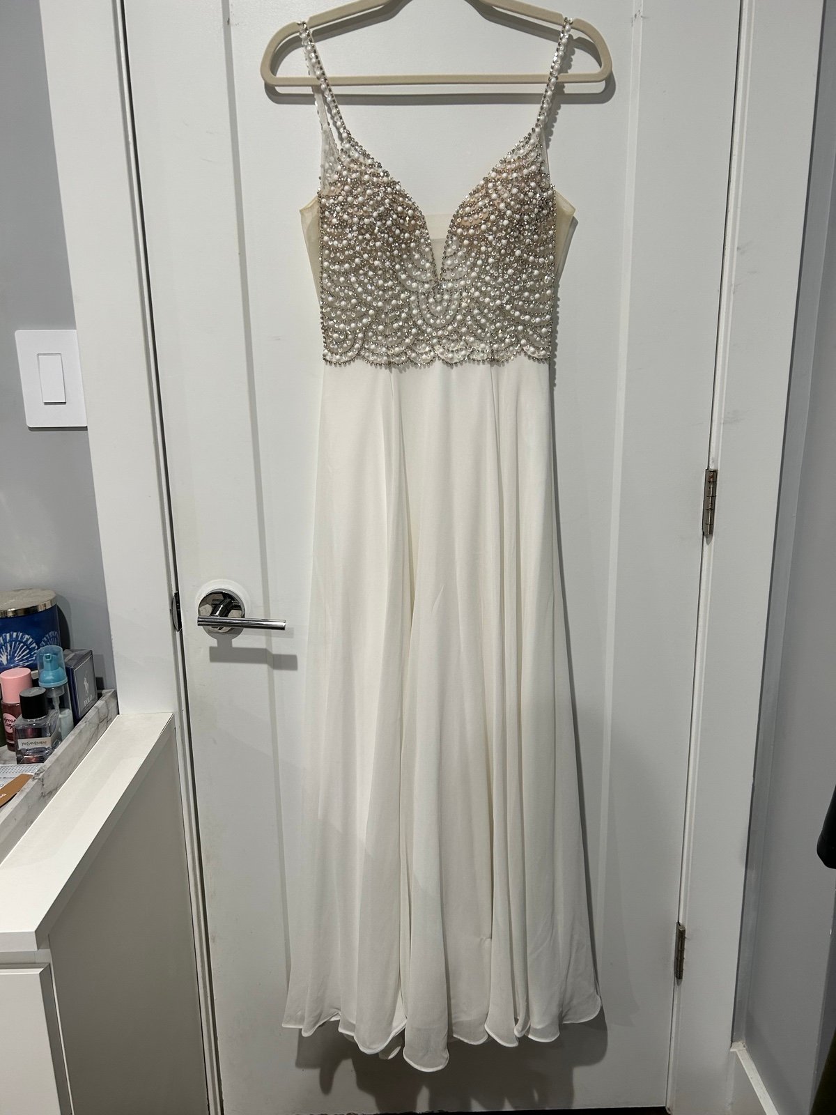 Gorgeous wedding dress worn for about 2 hours during my reception. It’s already been professional hemmed to my height 5’4 so perfect for anyone around the same height. The bottom is a bit dirty so it will need to be cleaned. Super comfortable and perfect for dancing! Size 4. Spent ~$350 on this including the hemming.