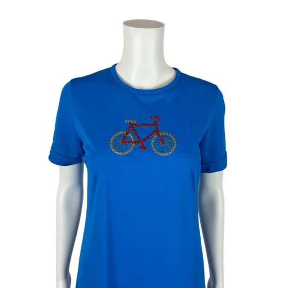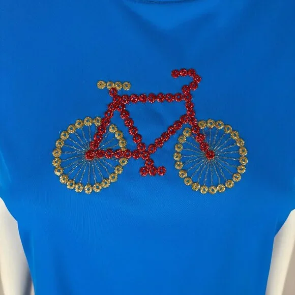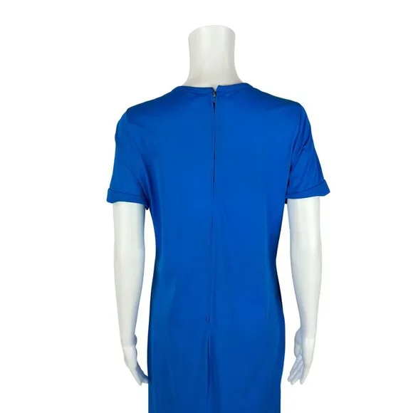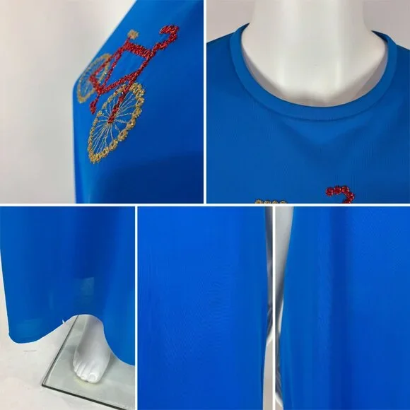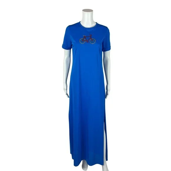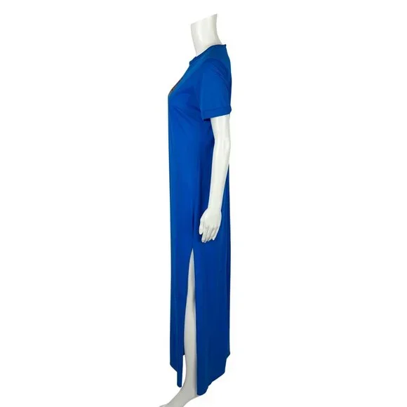 Vintage 70s Long Nightgown Women's Small Bicycle Embroidered Royal Blue Sleep DressDress zips up the back.LABEL: -FABRIC: feels like nylonMARKED VINTAGE SIZE: -SHOULDERS: 14.5"SLEEVE LENGTH: 7.5"BUST: 36"WAIST: 35"HIPS: 39"LENGTH: 56"SLIT: 26.5" from the hemCONDITION: great, see photos- has loose threads, popped seams around neckline, nipped at hem, has 2 spots on skirt, loose hemPINNED TO MODEL?: no☝For reference Mod's measurements are S 11", B 32.5", W 24", H 32.5"☝